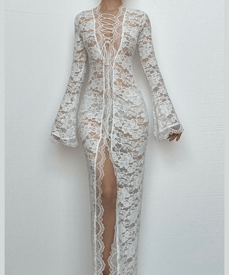 Sheer Floral Lace: Crafted from delicate, intricate white lace, this maxi dress creates a mesmerizing, ethereal silhouette. Its sheer quality is perfect for layering over swimwear or a slip.