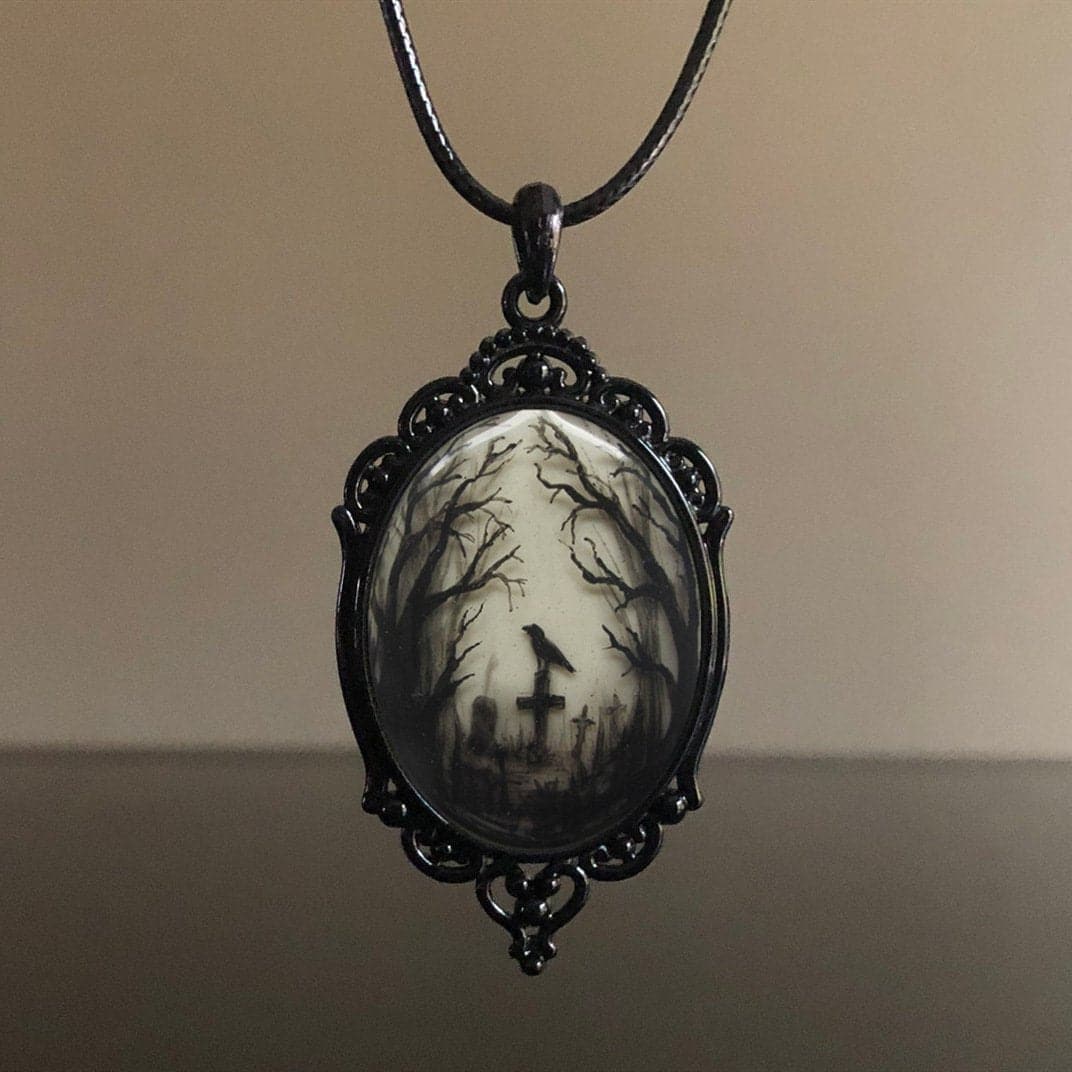 Inspired by classic gothic aesthetics and the allure of autumn nights, this pendant features a hauntingly beautiful miniature scene: a lone, enigmatic raven perched atop a tombstone, framed by bare, skeletal trees in an eerie, moonlit graveyard. The intricate tableau is encased within an ornate, blackened antique-style frame, reminiscent of treasured Victorian heirlooms.
